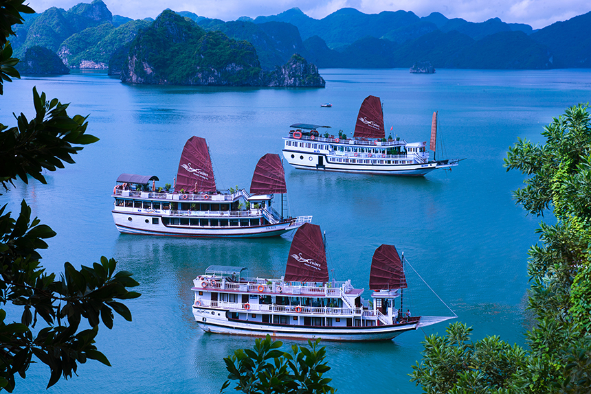 Visit the most beautiful sightseeing places on UNESCO World Heritage-listed Halong Bay including the Cave of Thien Canh Son, Bai Tu Long Bay, and Vung Vieng floating fishing area, Trong (Drum) Cave, Trinh Nu (Virgin) cave, Con Coc (Toad Islet), Three Peaches beach and Dark & Light Cave.