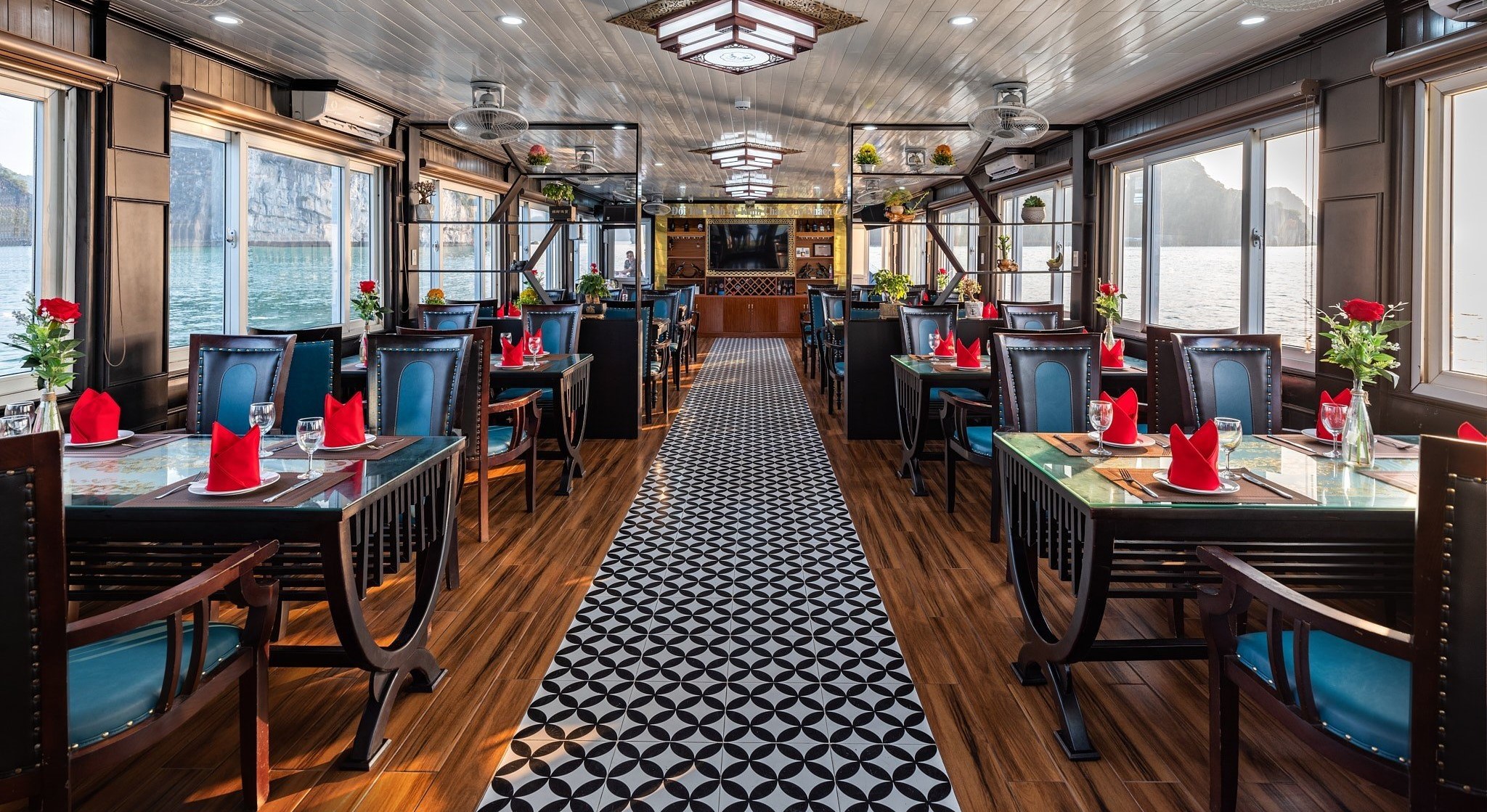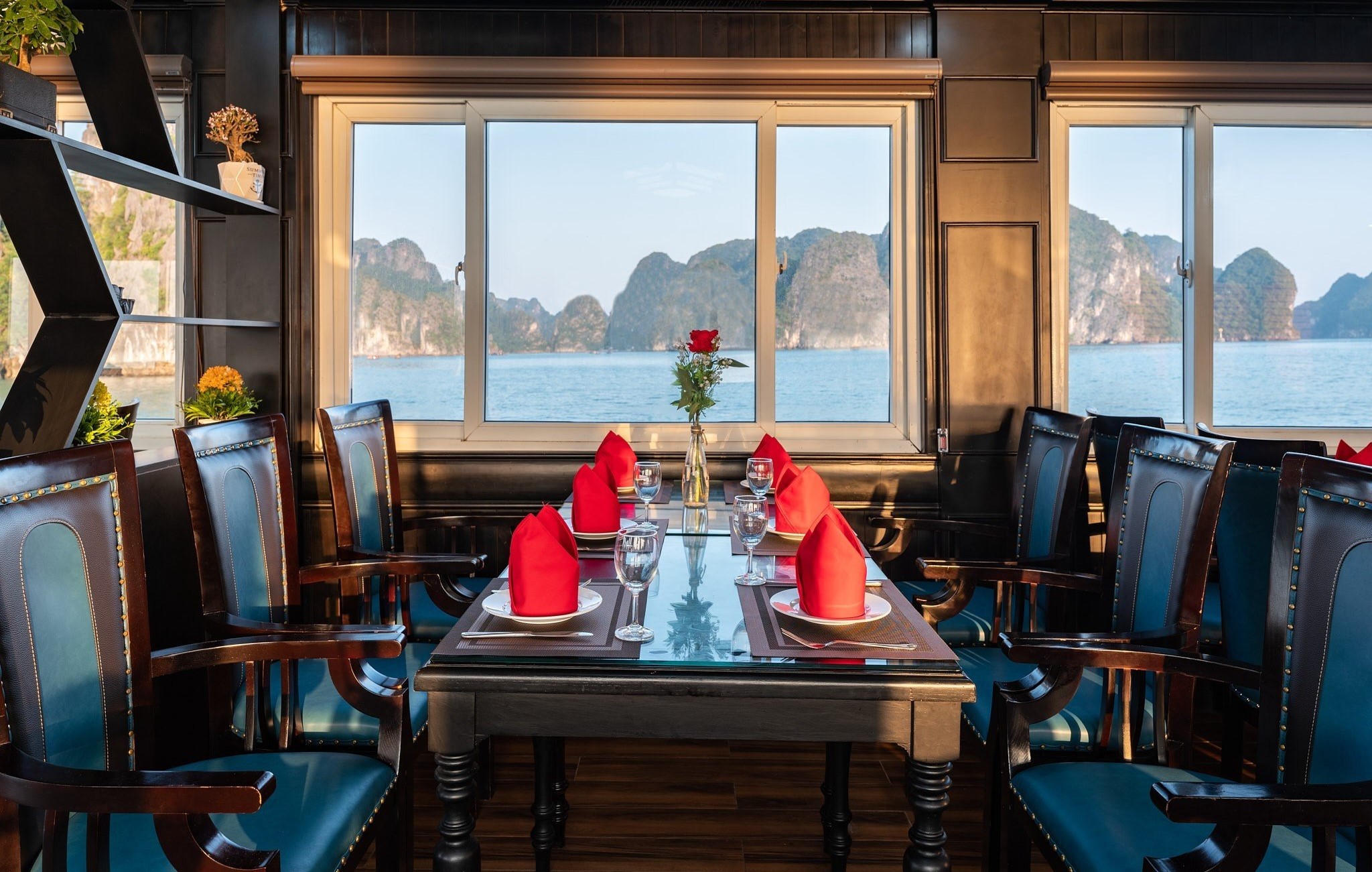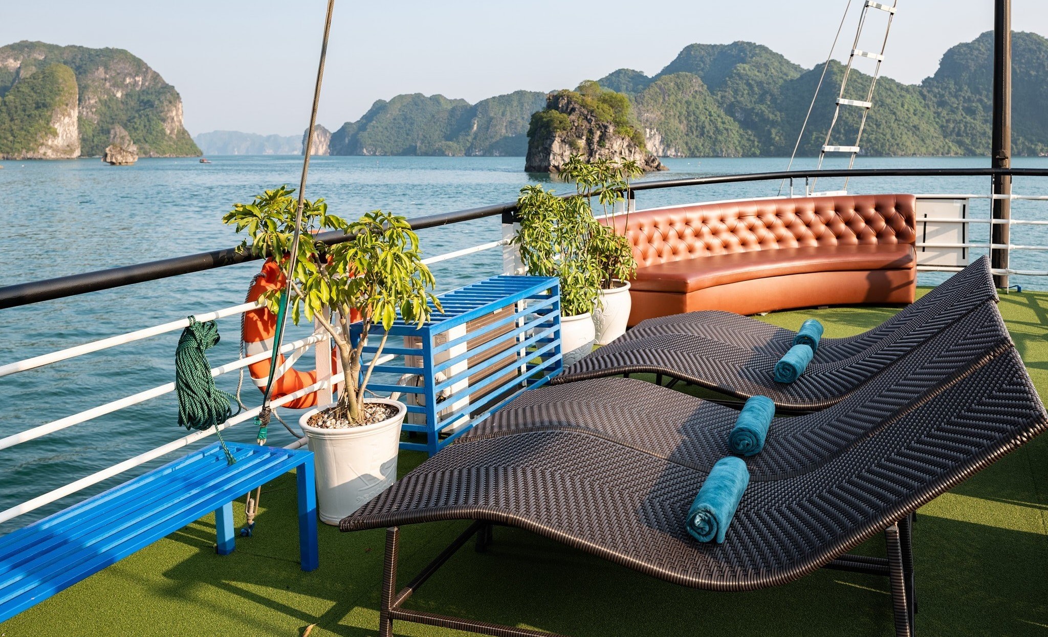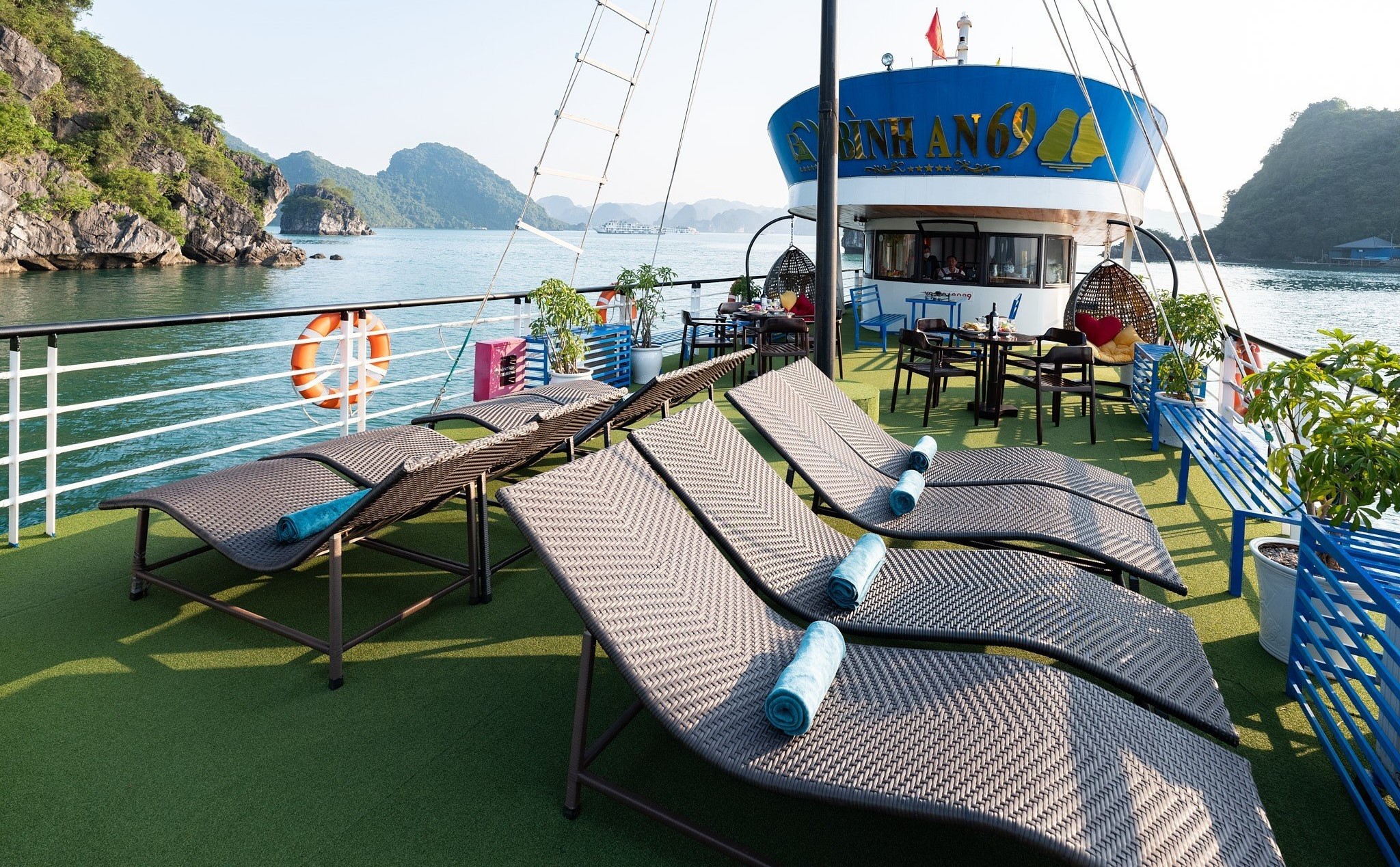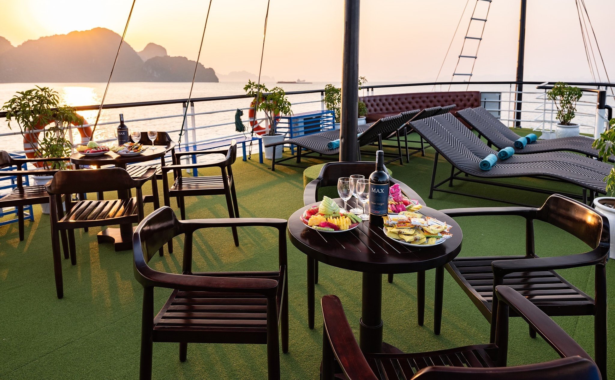 17h00 – 17h30: Cruising back to Tuan Chau harbor. There are a lot of time for enjoying sunset party with Wine, Tea, Cakes, sunbathing on upper deck with music and enjoying great fun of group touring fellows among world iconic natural scenery.