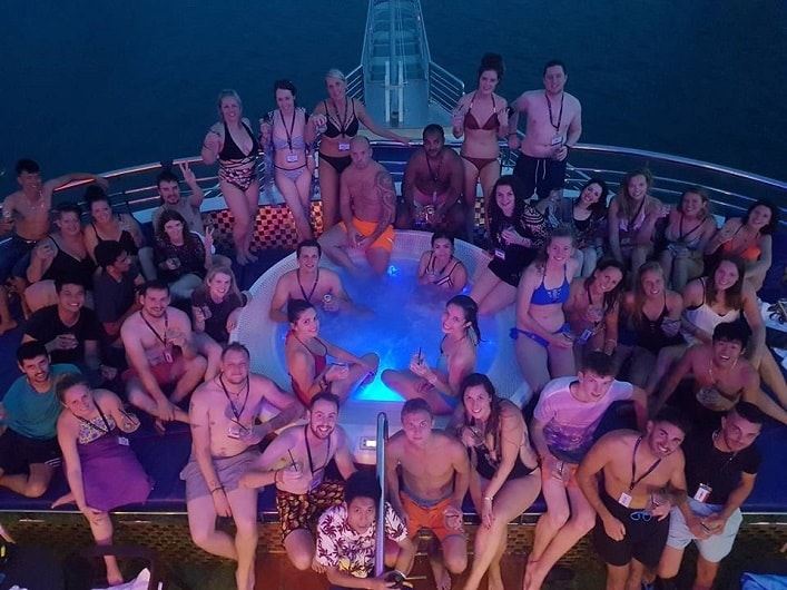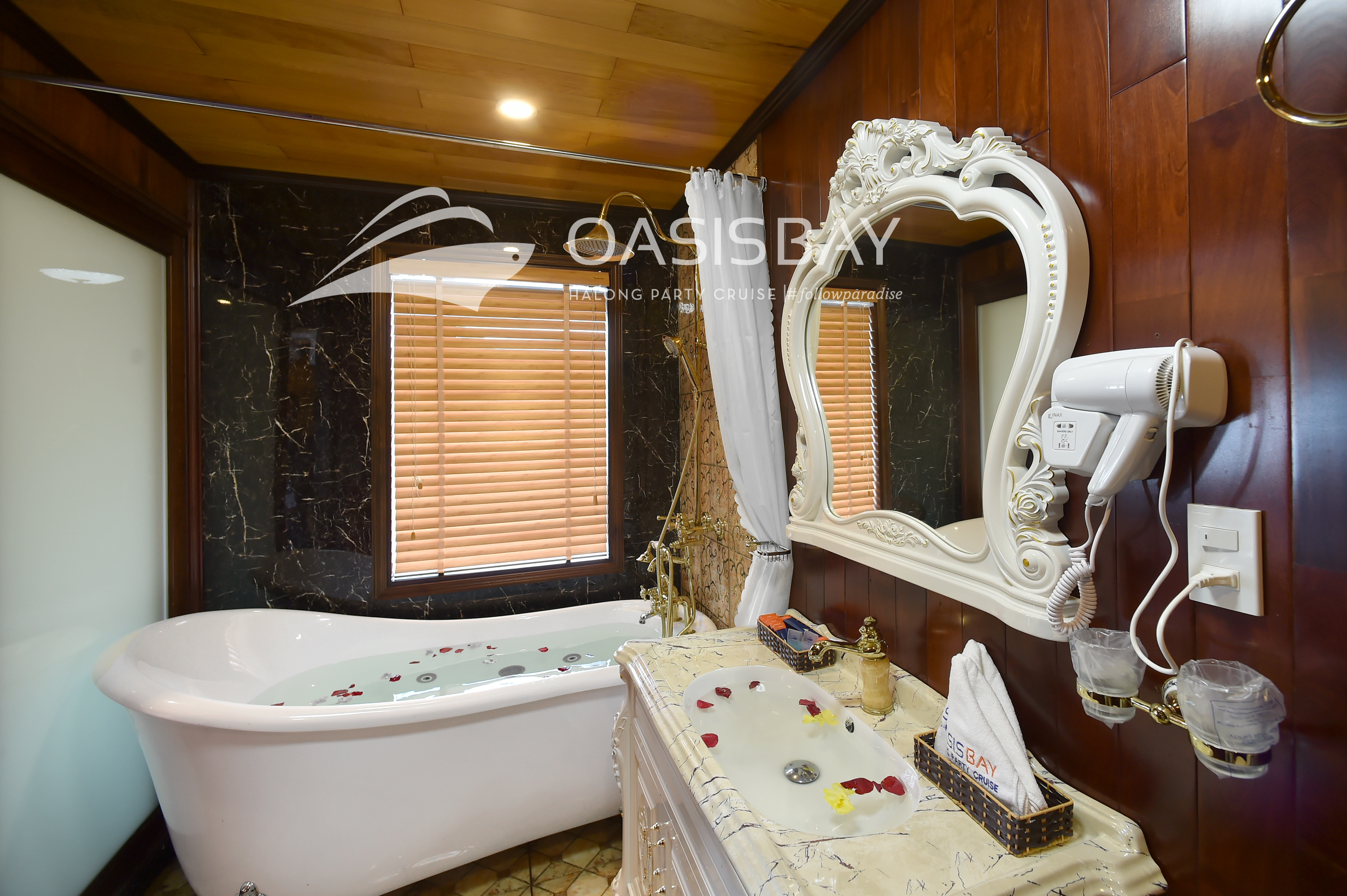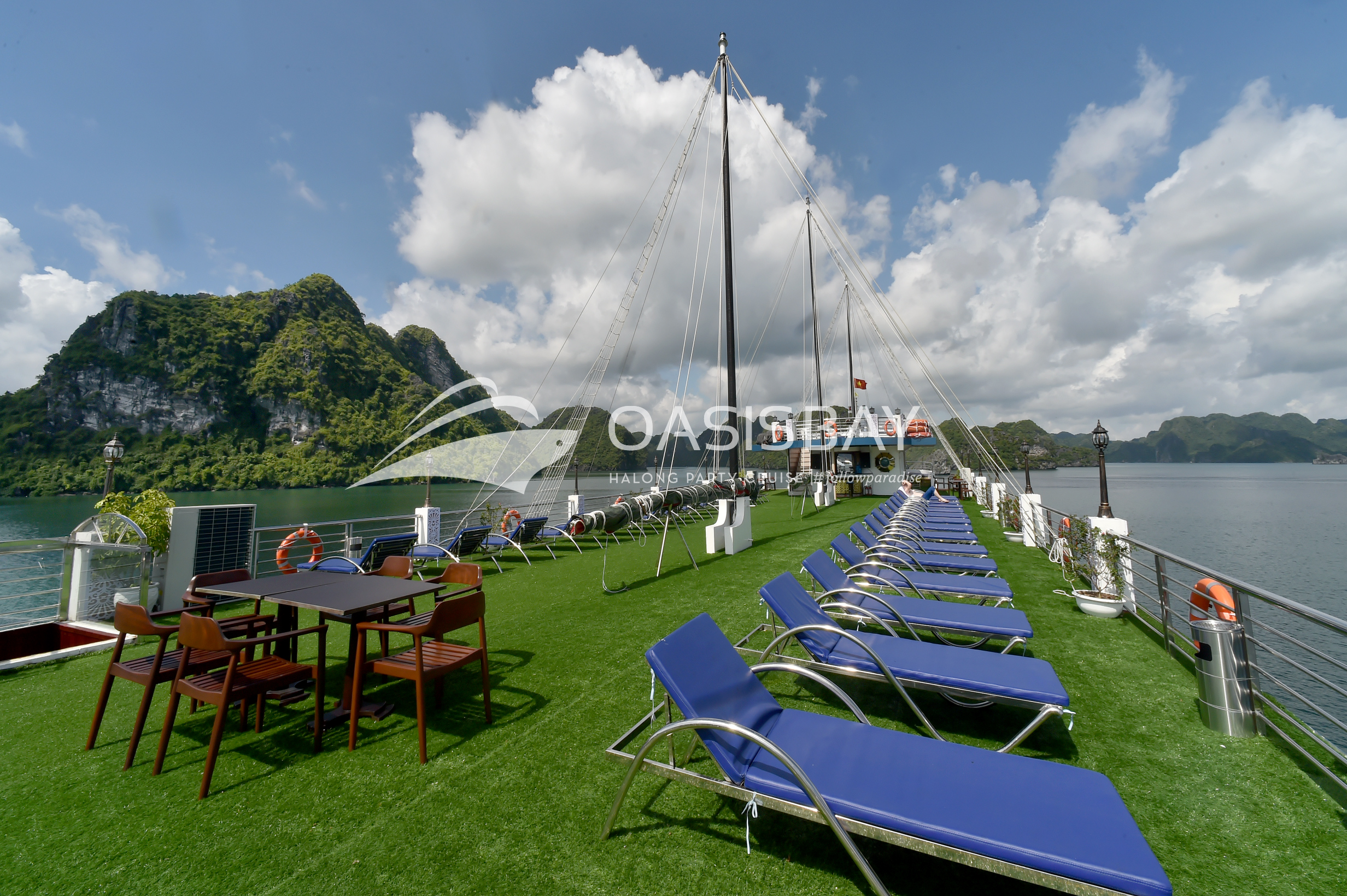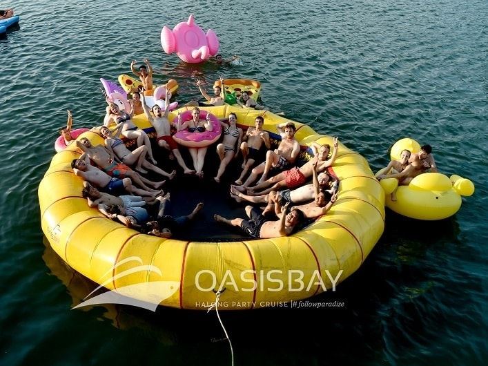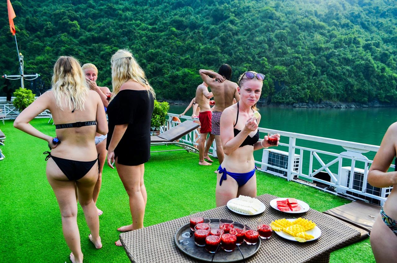 15:30 – 17:30: The cruise will bring you to the most traquil area of Halong Bay, getting away from the crowd where you can do somesault, backflip, kayak or take a dive. To top off, we also have a giant trampoline and jacuzzi arranged around the cruise.