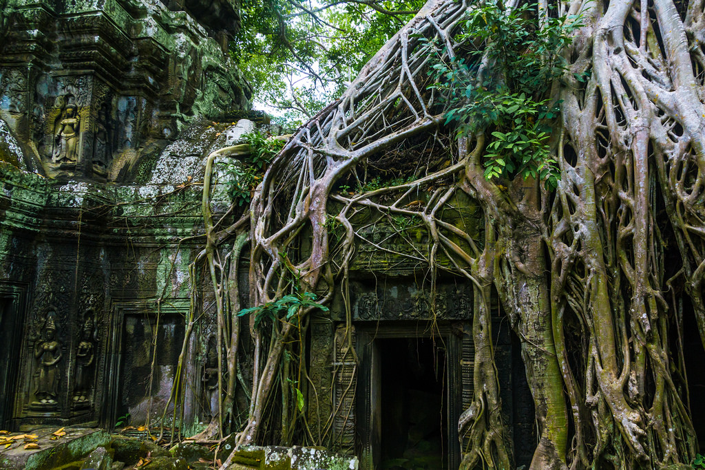 We visit the fabulous Ta Prohm embraced by the roots of enormous fig trees and gigantic creepers . Ta Prohm has been abandoned to the elements, a reminder that while empires rise and fall, the riotous power of nature marches on, oblivious to the dramas of human history . Left as it was ‘discovered’ by French explorer Henri Mouhout in 1860, the tentacle-like tree roots here are slowly strangling the surviving stones, man first conquers nature to create, nature later conquers back to destroy.